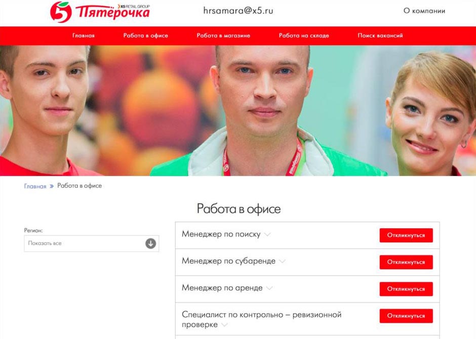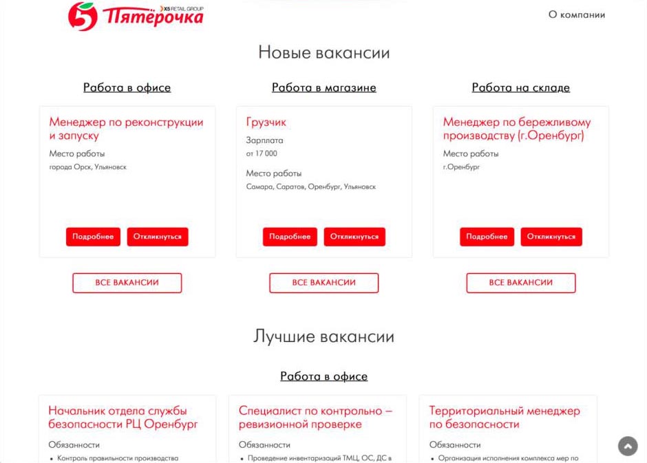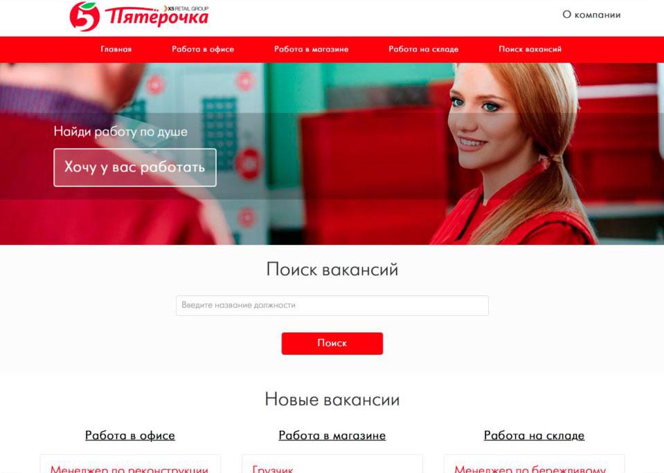 Сайт поиска кадров для сети магазинов «Пятёрочка»